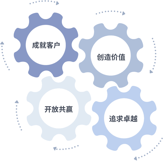 成就客户是一切决策的出发点,,,创造价值是衡量所有工作的标准,,,追求卓越是我们做事做人的态度,,开放共赢是我们的格局也是最终的结果。。价值观的齿轮环环相扣,,,,推动着组织里的每个人不断向前。。。。