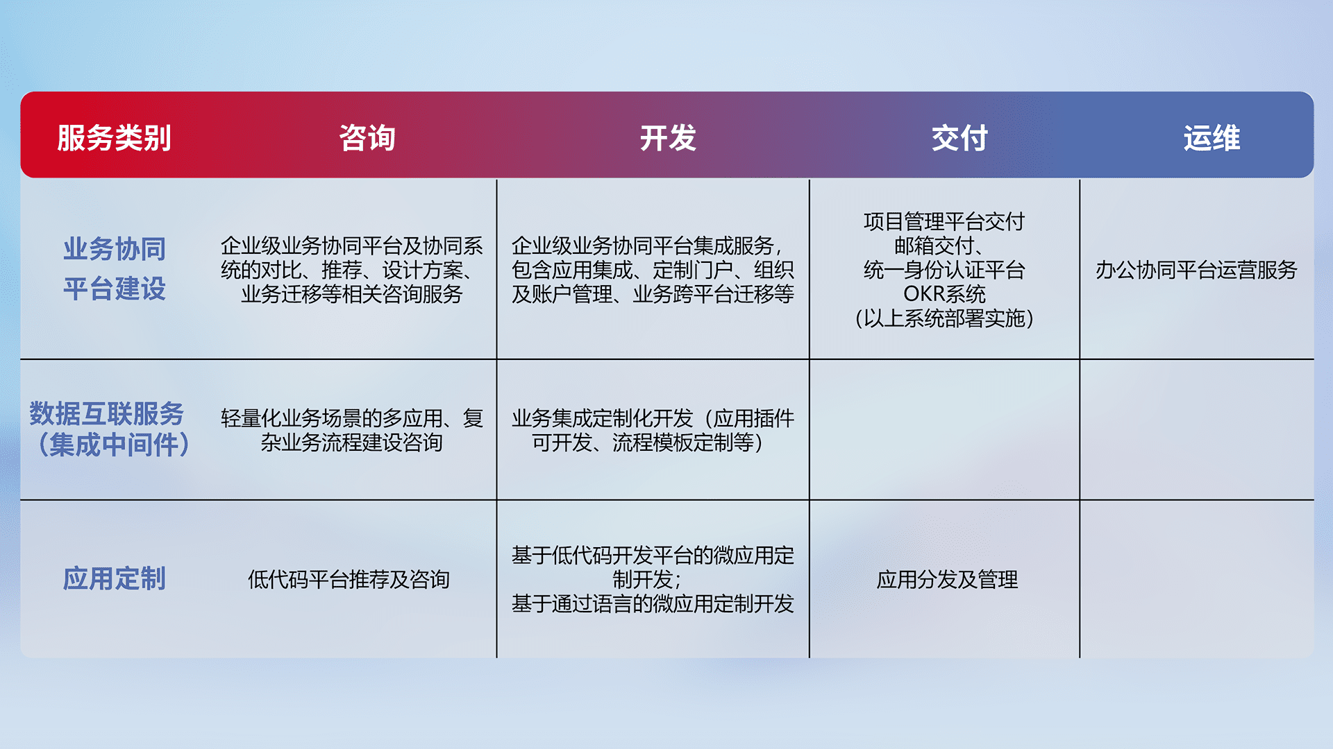 针对钉钉、、、企微、、IDaas等平台级产品提供产品的规划、、、、方案、、交付、、、、定制化开发等服务,,,,实现如统一协同办公、、智能客户服务、、、混合会议管理、、、智能数据查询、、、、等业务场景,,,,实现数字化转型。。。
